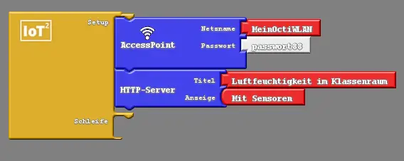 Wir können dem Octopus sagen, dass er neben dem Access Point auch eine Webseite aufbauen soll, auf der wir die erfassten Daten finden können. Dafür benötigen wir das Bauteil "HTTP-Server" aus der Schublade "IoT:HTTP-Protokoll". In Abbildung 9 kannst du sehen, dass du auch dieses Bauteil in den Setup-Block des Hauptbauteils setzen musst. In diesem Bauteil kannst du einen Titel für deine Webseite angeben. Weiter kannst du festlegen, ob die durch die Sensoren erfassten Daten auf der Webseite auftauchen sollen oder nicht.