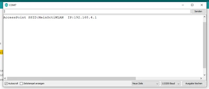 Wir möchten nun die Seite erreichen, die wir im letzten Abschnitt angelegt haben. Dafür müssen wir zuerst den seriellen Monitor öffnen. Hier finden wir eine Ausgabe, die der in Abbildung 10 ähnlich sein sollte. In dieser Ausgabe findest du eine IP-Adresse. Diese IP-Adresse markiert den Weg zum Webserver, hinter dem die von uns erzeugte Webseite liegt. Der eigene Access Point liefert immer die gleiche IP: 192.168.4.1