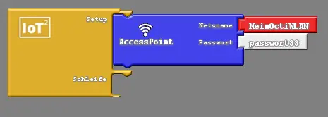 Um einen solchen Access Point aufzubauen, nehmen wir uns das entsprechende Bauteil aus der "IoT: Internet Zugang"-Schublade und legen es im Setup-Block des "IoT2"-Programmbauteils ab. Es ist wichtig, dass das Bauteil dort liegt, da das Netz nur einmal aufgebaut werden soll und nicht mit jedem Schleifendurchlauf. Abschließend legen wir noch einen Netzname und das Passwort für unser eigenes WLAN fest. Wichtig: Das Passwort muss mehr als acht Zeichen umfassen! Abbildung 8 zeigt dir noch einmal, welches Bauteil du benötigst und und wo du es platzieren musst.