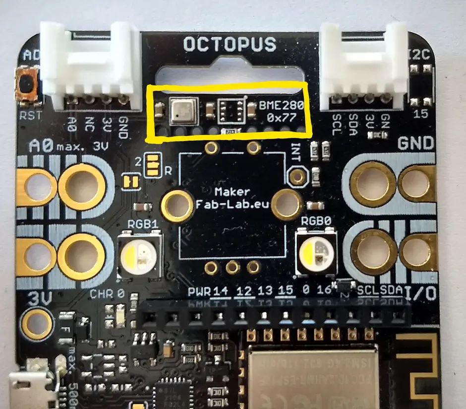 Der Ocopus bietet uns die Möglichkeit, sowohl die Temperatur als auch die Luftfeuchtigkeit im Raum zu bestimmen und diese über einer Webseite zu veröffentlichen. Dafür ist auf dem Octopus der "Bosch Umweltsensor BME 680" verbaut, den du in Abbildung 2 erkennen kannst. Er kann neben der Temperatur und der Luftfeuchtigkeit auch den Luftdruck und den relativen CO2-Gehalt im Raum messen.