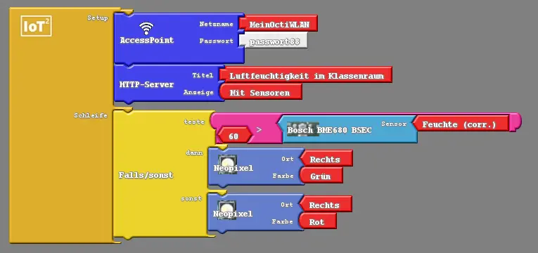 Wir können den Octopus verwenden, um im Klassenraum anzuzeigen, wann die Luftfeuchtigkeit zu hoch wird. Ein ähnliches Ardublock-Programm hast du bereits gesehen, als du Modul 2 bearbeitet hast. Hier haben wir den Octopus anzeigen lassen, wann eine Person lügt, beziehungweise, wann die Lautstärke im Raum zu groß ist. Auch hier werden wir die LEDs verwenden, um anzuzeigen, wenn die Luftfeuchtigkeit zu hoch ist. Dafür benötigen wir zum einen ein "Falls/sonst"-Bauteil und zwei Neopixel-Bauteile. In Abbildung 12 siehst du, wie wir das Programm aus Abbildung 9 erweitern müssen, um die LED im Fall zu hoher Luftfeuchtigkeit rot aufleuchten zu lassen.