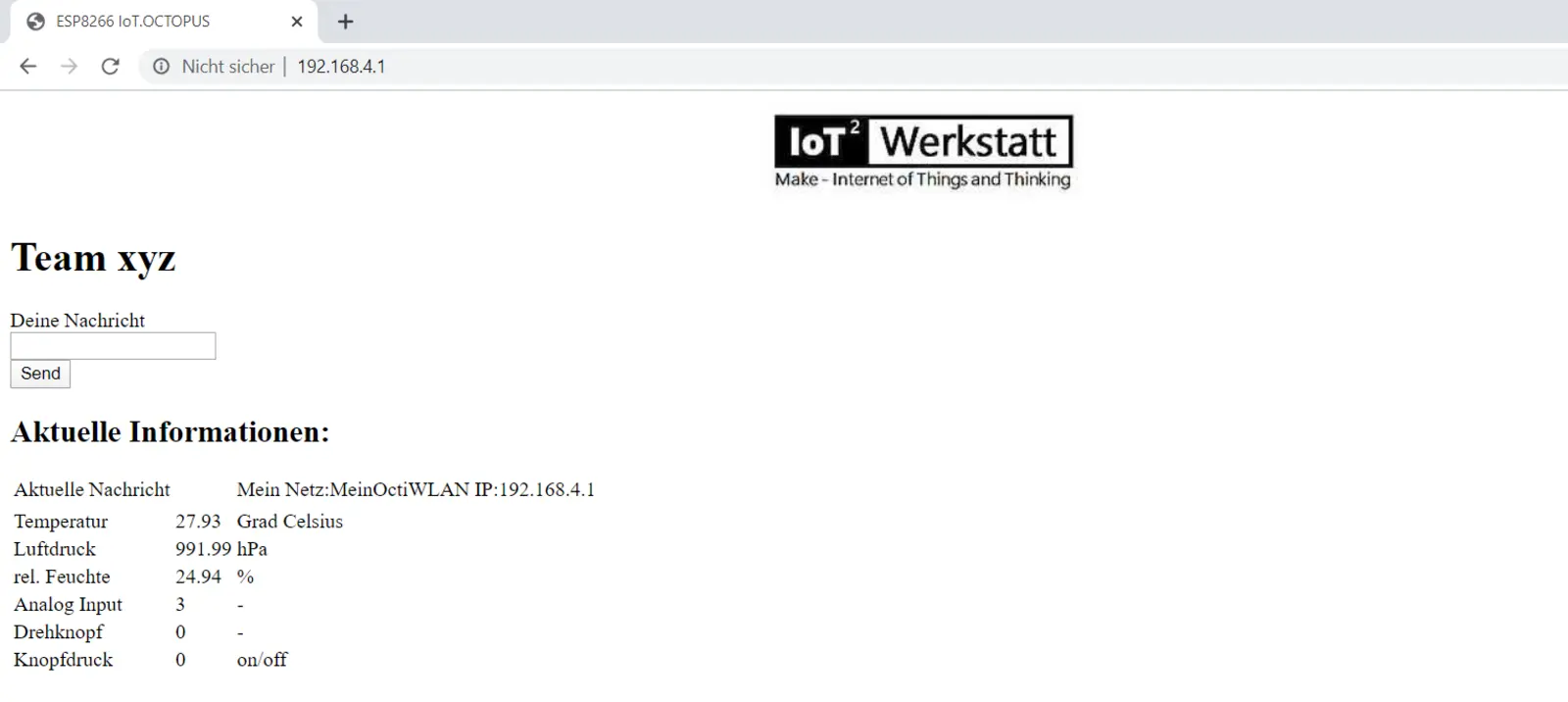 Weiter besitzt der Octopus ein WLAN-Modul, wodurch wir in der Lage sind, auf den Octopus zuzugreifen und Luftfeuchtigkeit sowie Temperatur im Raum auszulesen.
