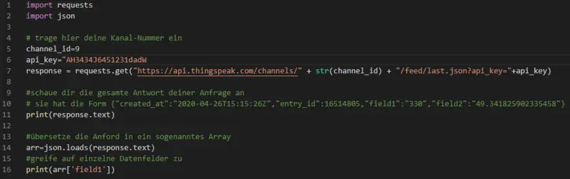 In Abbildung 7 siehst du ein Programm, dass als Grundlage für das Auslesen der Daten dient. Auch hier benötigst du deine Kanal-Nummer und deinen API-Key, um auf die Daten zugreifen zu können. Als erstes senden wir eine Http-Anfrage an Thingspeak und erhalten ein Objekt zurück. Dieses Objekt geben wir auf dem Bildschirm aus. Sie hat die Form {"created_at":"2020-04-26T15:15:26Z","entry_id":16514805,"field1":"330","field2":"49.341825902335458"}. Da wir nichts mit dieser Form, die man JSON nennt, anfangen können, übersetzen wir diese Form in ein sogenanntes Array, eine Art Tabelle, in welcher wir auf einzelne Tabellenfelder zugreifen können. Im Beispiel auf der rechten Seite greifen wir auf das erste Datenfeld zu.