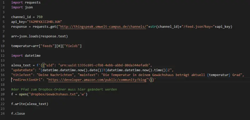 Unser Python Skript muss so gestaltet werden, dass es den Thingspeak-Kanal ausliest und die Datei im Dropbox-Ordner überschreibt. Als Grundlage verwenden wir das Python-Skript von weiter oben (vergleiche Abbildung 7) und erweitern es wie in Abbildung 21 dargestellt.