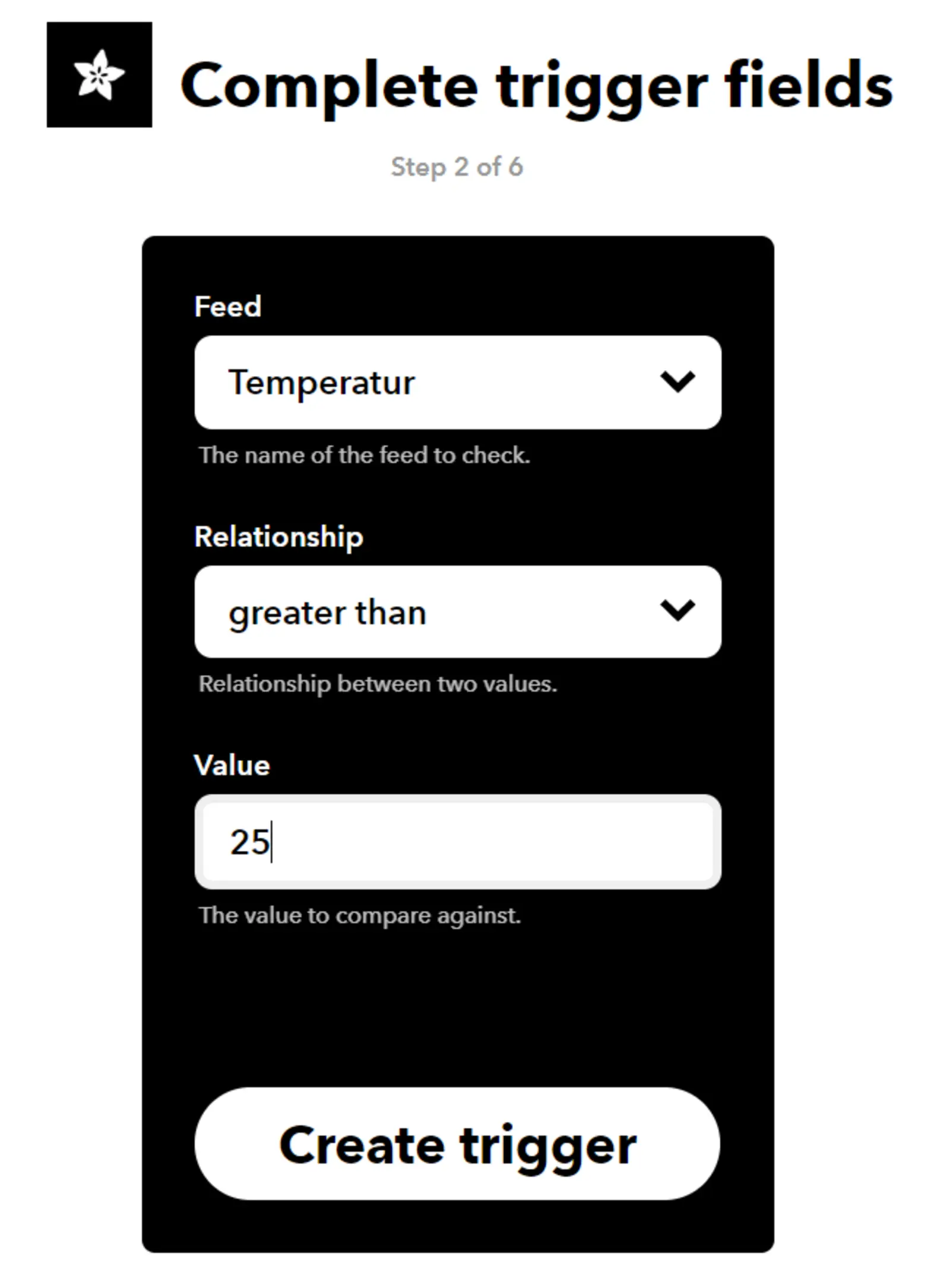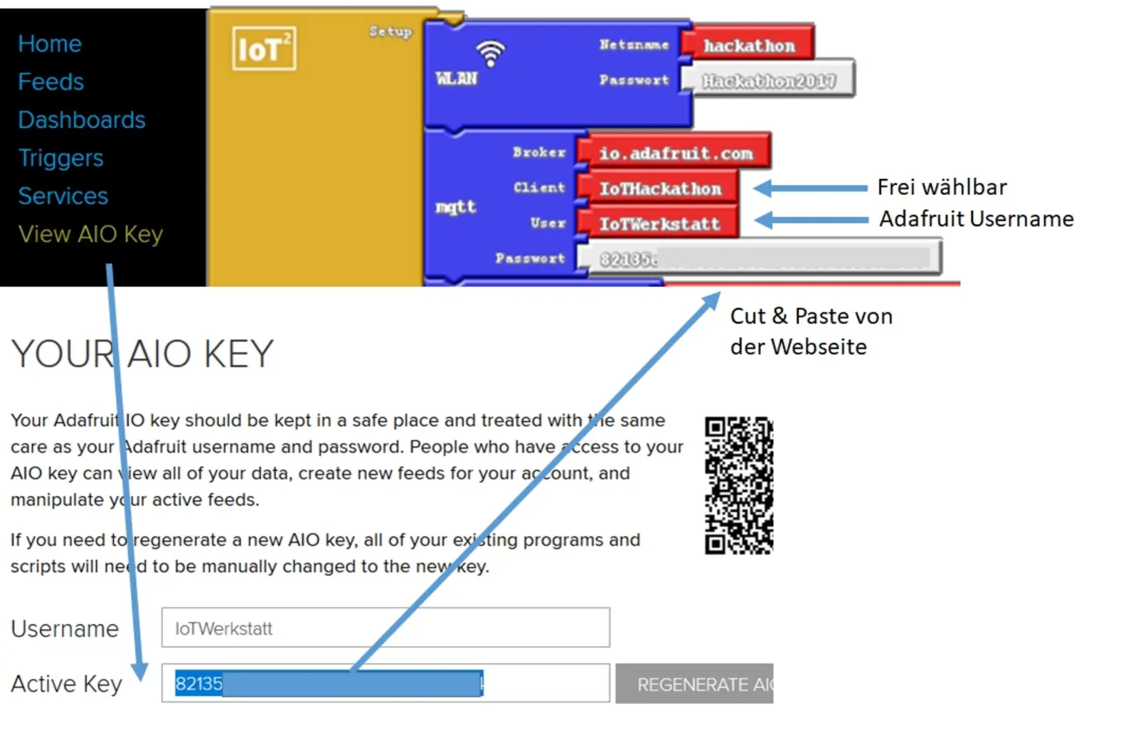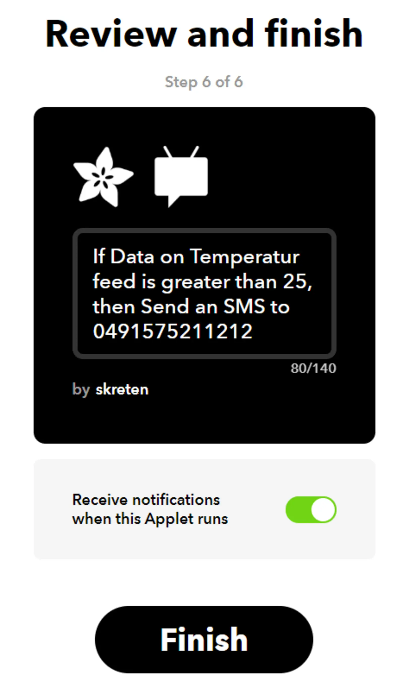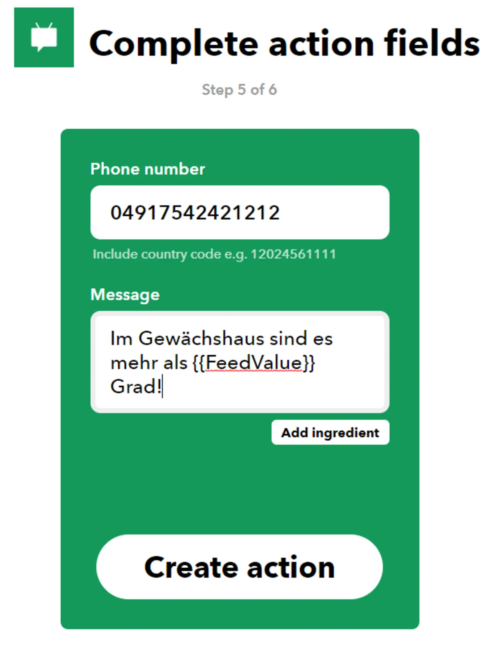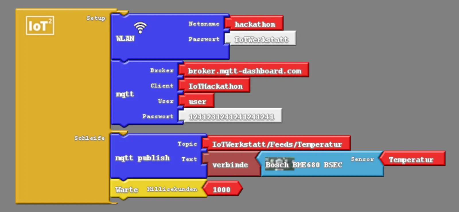Um eine SMS zu erhalten, wenn die Temperatur zum Beispiel in unserem Gewächshaus zu hoch ist, benötigen wir die Unterstützung zweier Plattformen. Zuerst benötigen wir eine Alternative zu Thingspeak. Hierfür verwenden wir https://io.adafruit.com/. Auf dieser Seite können wir, wie in Abbildung 8 angezeigt, einen sogenannten Feed erzeugen. Ein Feed hat wie bereits beim Thingspeak eine eindeutige Erkennungsnummer sowie einen Namen, Topic genannt, und kann über das Protokoll MQTT mit Daten beschrieben werden. Für dieses Protokoll gibt es ebenfalls ein Bauteil in der IoT:MQTT-Protokoll Schublade des ArduBlock (vergleiche Abbildung 9). Die Erkennungsnummer des MQTT-Feeds muss hier eingetragen werden. Sobald unser Programm wie jenes in Abbildung 10 aussieht (achte darauf den Topic-Namen an deinen Feed gemäß dem Muster Nutzername/Feeds/Feedname anzupassen), können wir uns mit der Einstellung der Email befassen. Folge hierfür der Bilderstrecke von Abbildung 11 bis zum Ende!