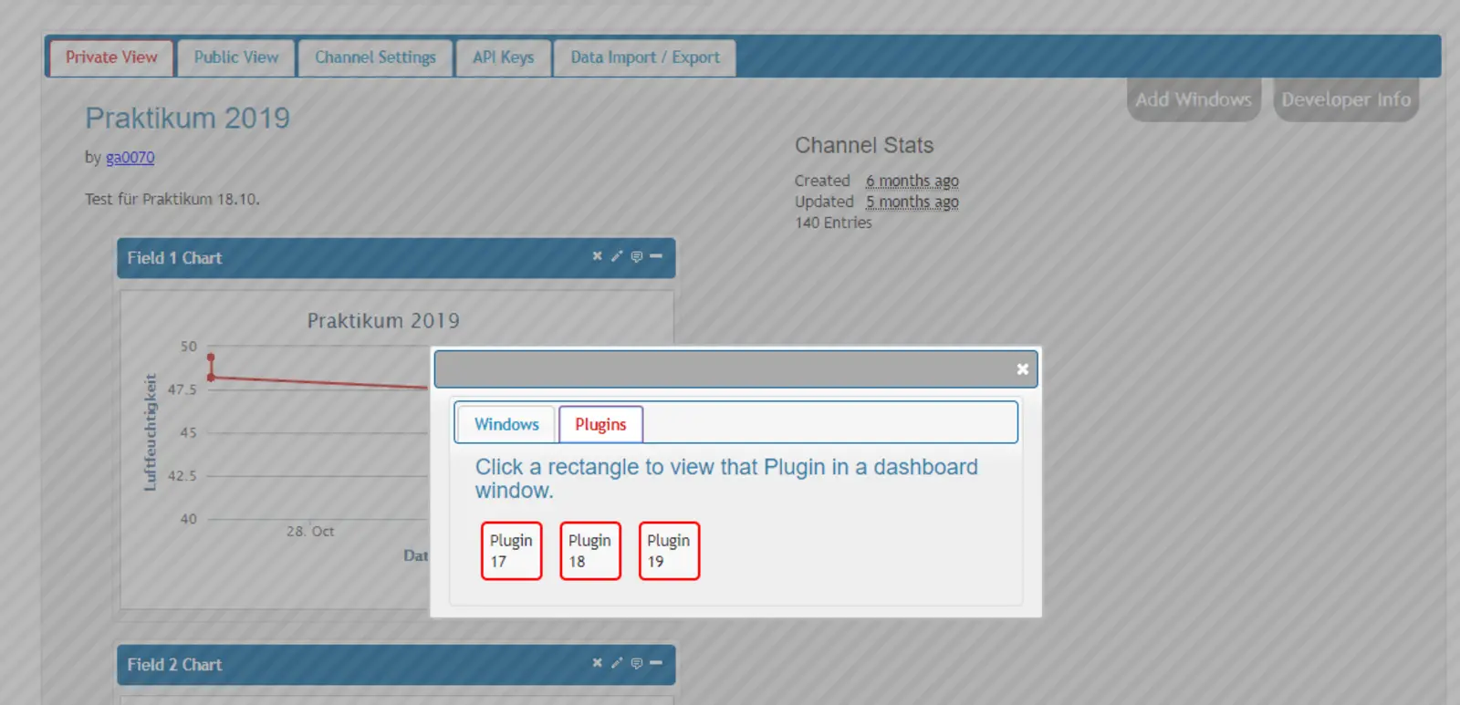 Ab jetzt solltest du das Plugin in deinem Kanal verwenden können, indem du unter "Private View" auf "Add Windows" und dort auf "Plugins" klickst. Hier sollte nun dein Plugin auftauchen (vgl. Abbildung 5). Wenn du es auswählst, taucht es als zusätzliche Anzeige in deinem Kanal auf (vgl. Abbildung 6).