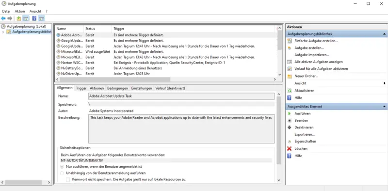 Damit immer neue Daten in die Datei geschrieben werden, müssen wir das Pythonskript beispielsweise alle dreißig Minuten erneut ausführen. Dies kann man über verschiedene Wege erreichen. Ein Weg ist die Aufgabenplanung unter Windows. Hier kannst du Aufgaben festlegen, die zu bestimmten Zeiten wiederholt werden sollen (Abbildung 26). Voraussetzung ist natürlich, dass der Rechner an ist.