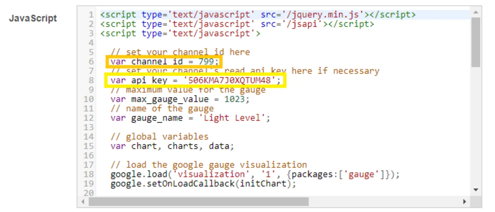 Im nächsten Bildschirm musst du deine Kanal-Nummer und deinen API-Key angeben. Weiter solltest du deinem Plugin einen eindeutigen Namen geben. Wo du den API-Key findest, weißt du bereits aus Modul 4. Die Kanal-Nummer findest du unter "Channel Setting". Trage beides an den markierten Stellen in Abbildung 4 ein.