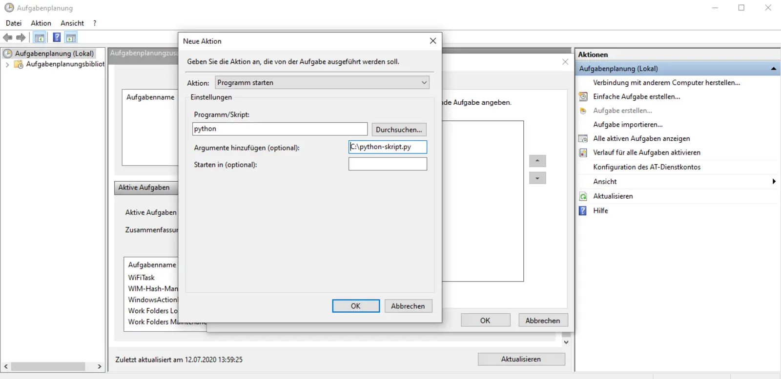 Hier musst du nur eine neue Aufgabe erstellen, den Uhrzeittrigger auswählen (zum Beispiel: stündlich) und die Python-Datei auswählen (vgl. Abbildung 27). Alles weitere übernimmt dein Rechner für dich.