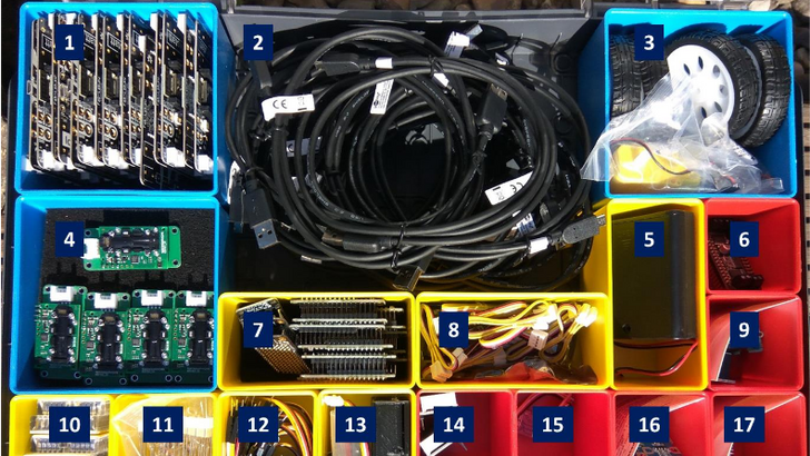 Unser Octopus hat einen Mitstreiter bekommen. Mit dem ESP32 des Makey:Lab wurde die IoT2-Werkstatt um einen leistungsfähigeren Mikrocontroller erweitert. Neben Umweltsensors (Bosch BME 680) stehen Mikrofon sowie ein Farb- und Abstandssensor zur Verfügung. Erweiterungen lassen sich über das Grove-System flexibel anstecken.