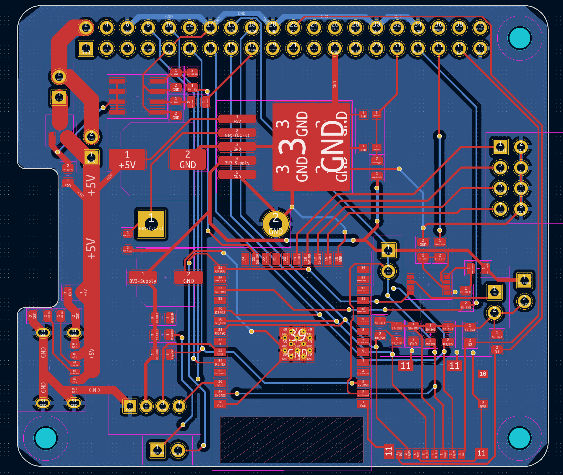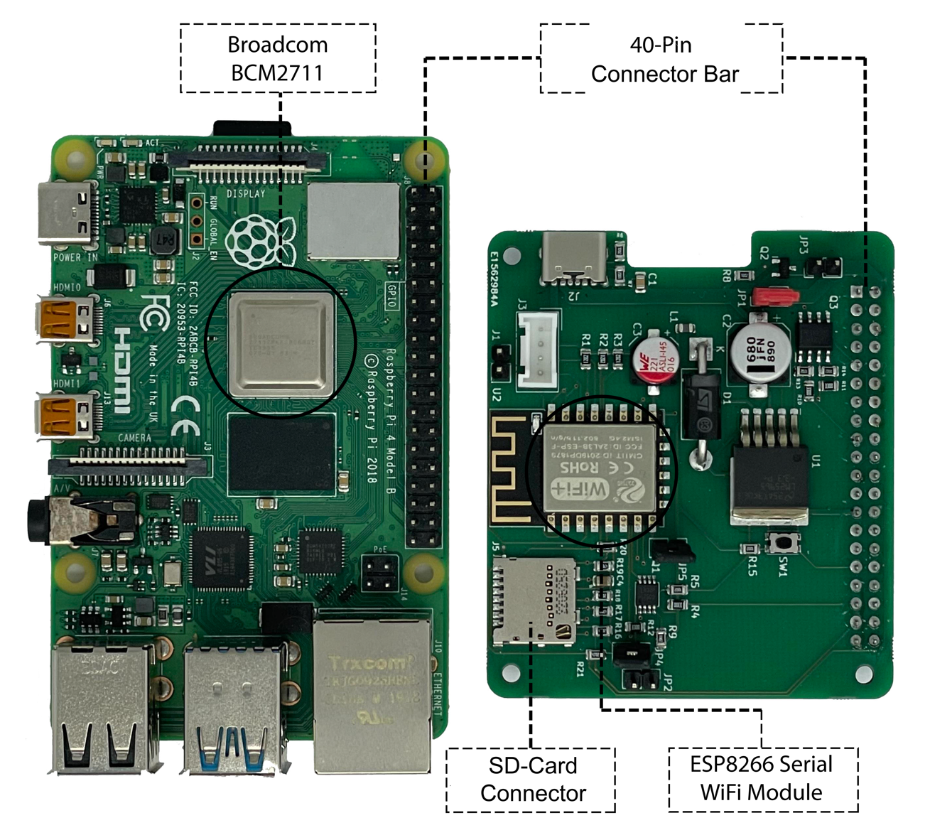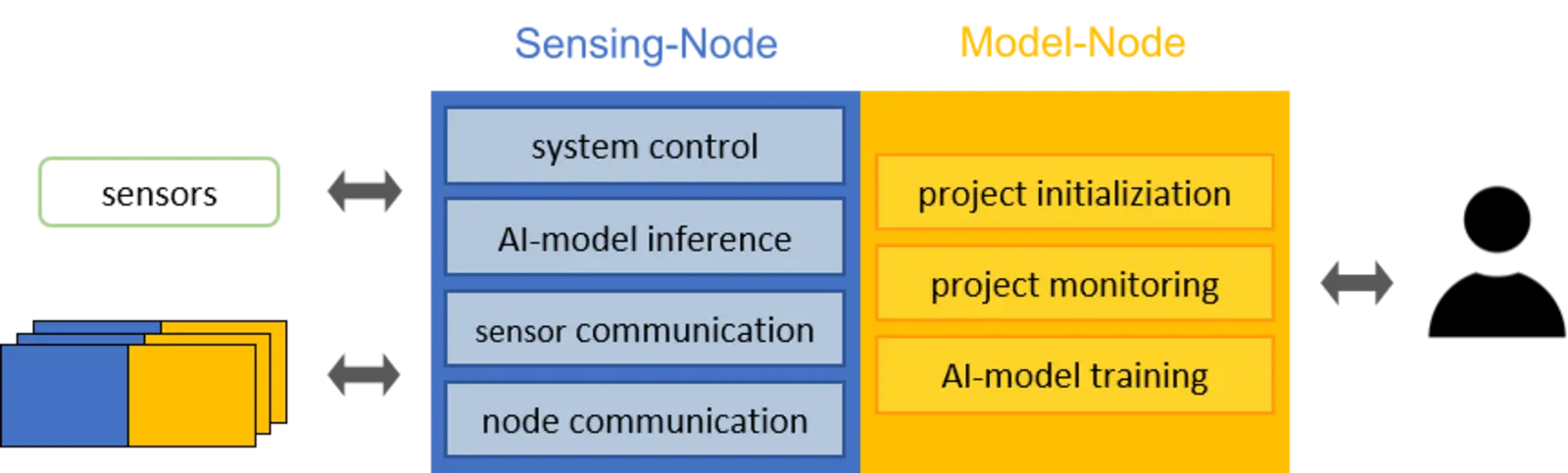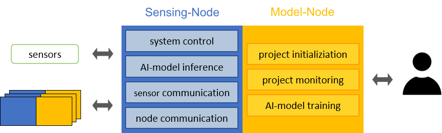 Bei dem AI on Device Board handelt es sich um eine HAT-Platine welche lokale Datenerfassung, Inferenz und automatisches Nachtrainieren von TinyML-Modellen ohne Cloud-Anbindung ermöglicht. Es besteht aus zwei Hauptkomponenten: einem stromsparenden Sensing-Node (ESP8266) zur Sensoranbindung und Modellausführung sowie einem leistungsfähigeren Model-Node (Raspberry Pi 4) zur Verwaltung und zum Training neuer Modelle. Beide Einheiten nutzen eine gemeinsam genutzte SD-Karte zur lokalen Speicherung von Messdaten, Konfigurationen und Modellen. Durch diese Architektur wird eine datenschutzfreundliche, autonome und ressourcenschonende KI-Verarbeitung direkt auf dem Gerät realisiert.