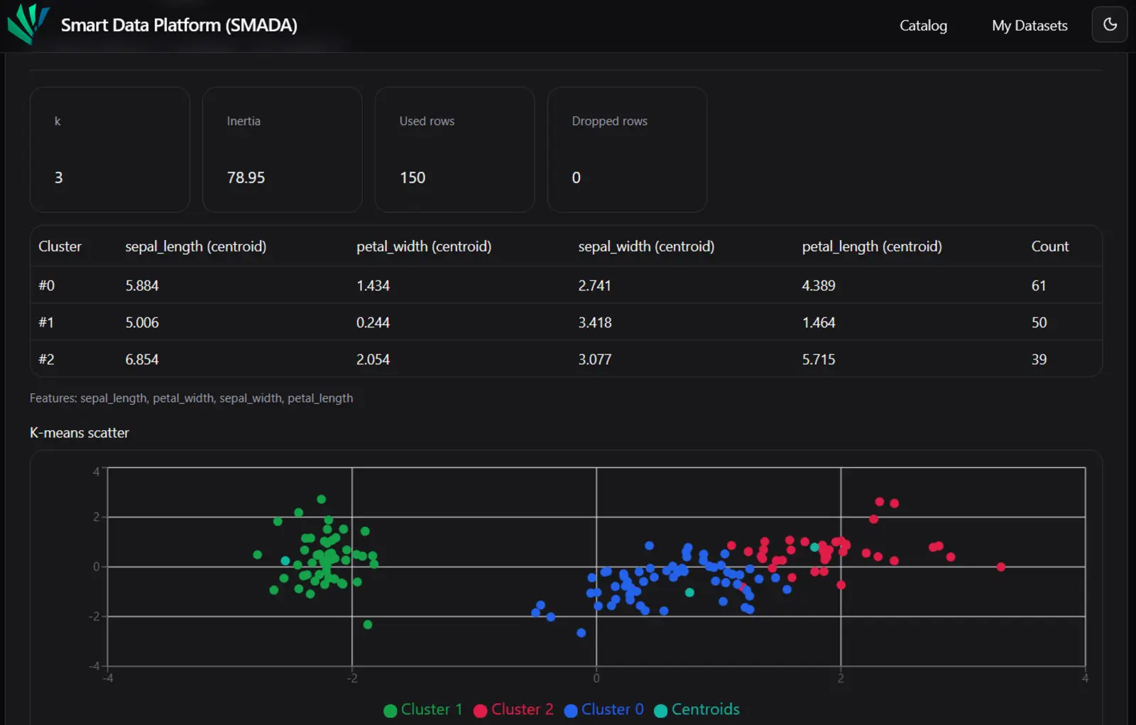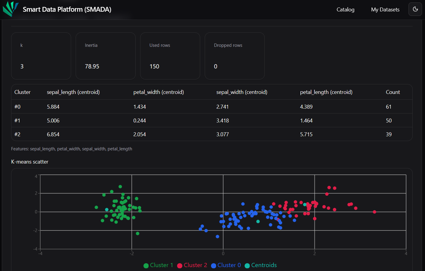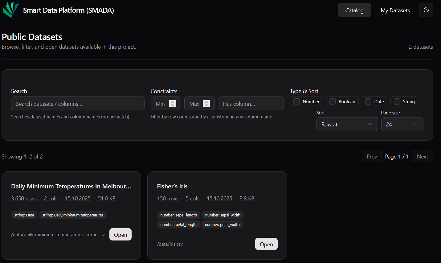 Die smarte Datenplattform stellt ein integriertes System zur Verfügung, das es ermöglicht, Datensätze über eine webbasierte Benutzeroberfläche hochzuladen und zu speichern. Eine Suchkomponente erlaubt das gezielte Auffinden von Datensätzen anhand frei definierbarer Suchkriterien und Metadatenfilter. Automatisierte Verfahren zur Metadatenextraktion analysieren eingehende Datenstrukturen und generieren standardisierte Merkmalsvektoren, auf deren Basis ein KMeans-basiertes Clustering vorgenommen wird, um ähnliche Datensätze zu gruppieren. Ergänzend liefert ein Recommendation-System (SVD) Empfehlungen relevanter Datensätze. Über eine REST-API mit API-Key-Authentifizierung kann die Plattform bidirektional mit externen Anwendungen kommunizieren. Vorverarbeitungsfunktionen wie Datenbereinigung, sowie linguistische Texttokenisierung (pandas, fuzzywuzzy) sind integriert.