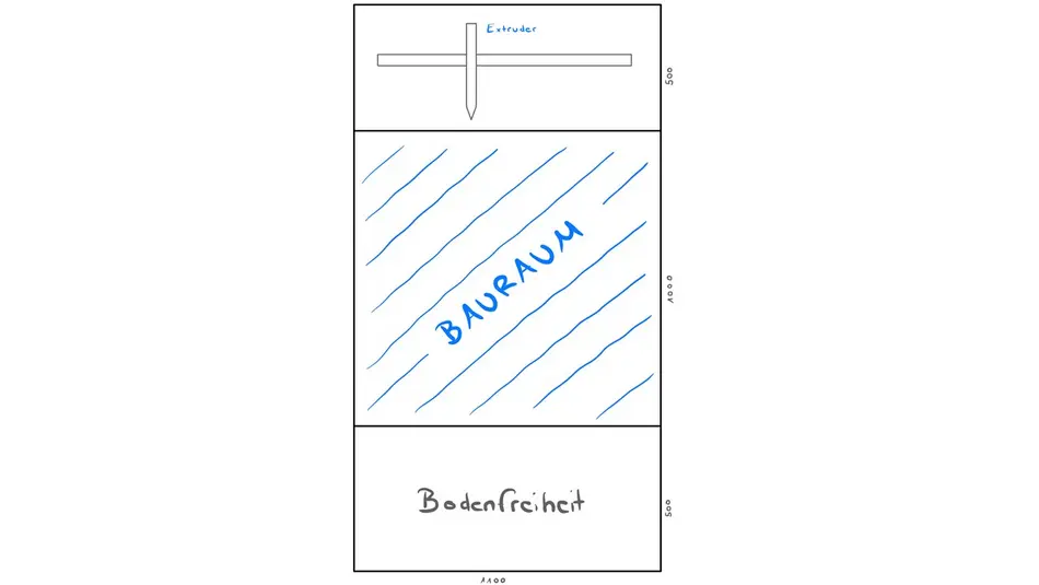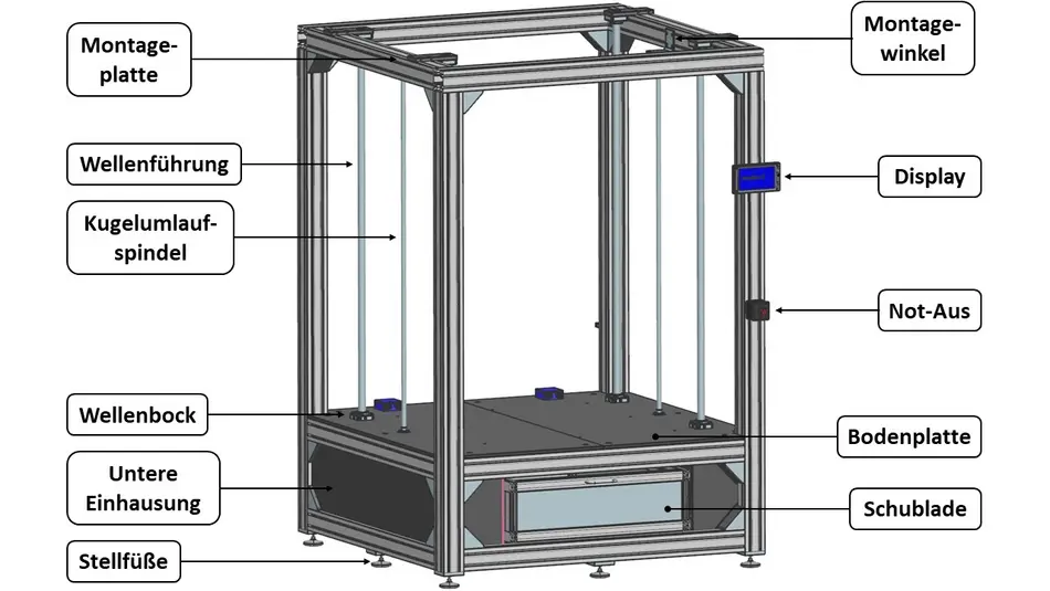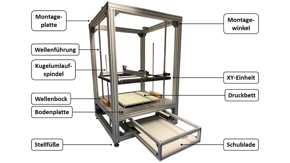 Ziel war es, einen funktionsfähigen Drucker aufzubauen, bei dem verschiedene Aufrüstungsmöglichkeiten bereits vorgesehen sind. So wurde der Drucker mit einem offenen Bauraum gebaut, allerdings ist die Nachrüstung einer Bauraumheizung sowie die Einhausung des Druckers vorgesehen. In Abbildung 2 ist eine Übersicht des Gehäuses inklusive einer Schublade zur Unterbringung der Elektrik dargestellt.