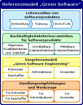 Ausgehend von einer detaillierten Analyse wurde ein konzeptuelles Referenzmodell erstellt, das Softwareentwickler und Softwarenutzer bei der nachhaltigen Erstellung und Nutzung von Software unterstützen soll. Das Referenzmodell „Green Software“ enthält als Teilmodelle einen ganzheitlichen Lebenszyklus für Softwareprodukte, Nachhaltigkeitskriterien und -metriken für Softwareprodukte, das Vorgehensmodell „Green Software Engineering“ sowie Handlungsempfehlungen und Werkzeuge.