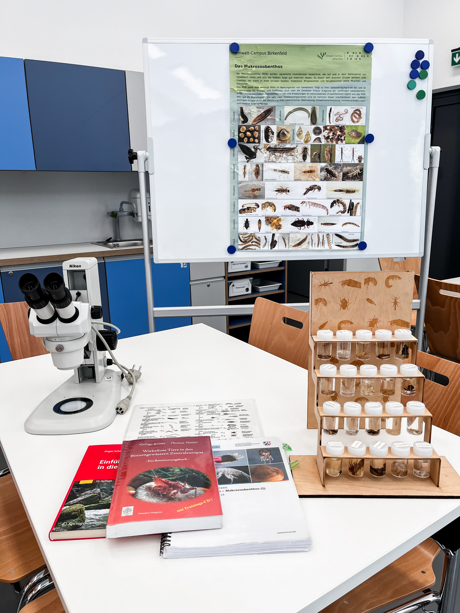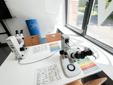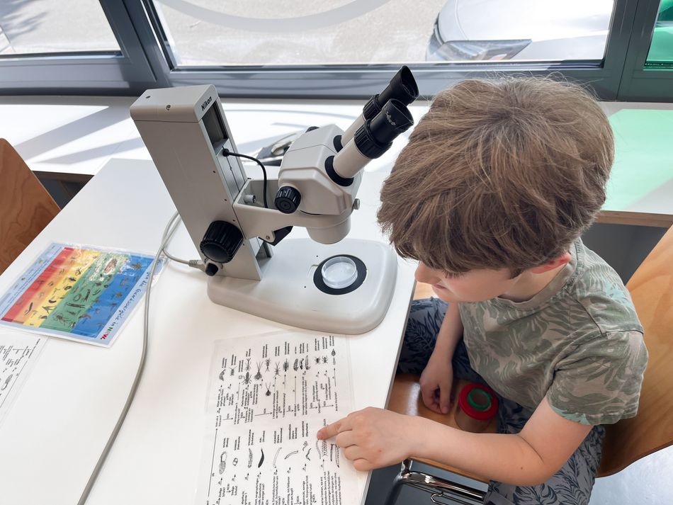 Im Blauen Klassenzimmer wird den Teilnehmenden dann eine neue Sichtweise auf die Tiere geboten, indem diese die Möglichkeit bekommen die Tiere stark vergrößert unter dem Mikroskop zu betrachten. Außerdem werden die Teilnehmenden an die Bestimmung der Gewässertiere herangeführt. Zum Schluss kommen die Tiere wieder zurück in den Flachsbach.