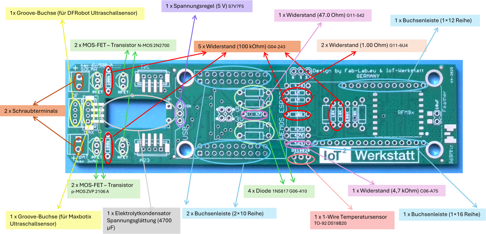 Unsere Platine muss in das PVC-Rohr passen und soll außerdem mit Solar und Akku betrieben werden. Wir verwenden einen ESP32 und ein Featherwing Lora Funkmodul. Über einen Grove-Anschluss schließen wir den Ultraschallsensor an. Die Pinbelegung für unsere beiden Sensoren sind unterschiedlich, weshalb wir zwei Anschlüsse geplant haben.