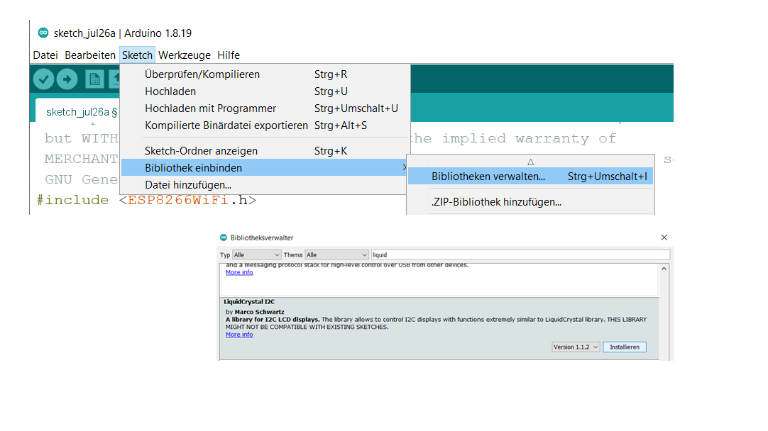 So ist ein neuer Sensor oder ein spezielles Display schnell eingebunden. Einfach die entsprechende Bibliothek auswählen und den C-Code aus dem jeweils mitgelieferten Beispiel nutzen. Alternativ die Lib in den Ordner \IoTW\arduino-1.8.19\portable\sketchbook\libraries\ kopieren.