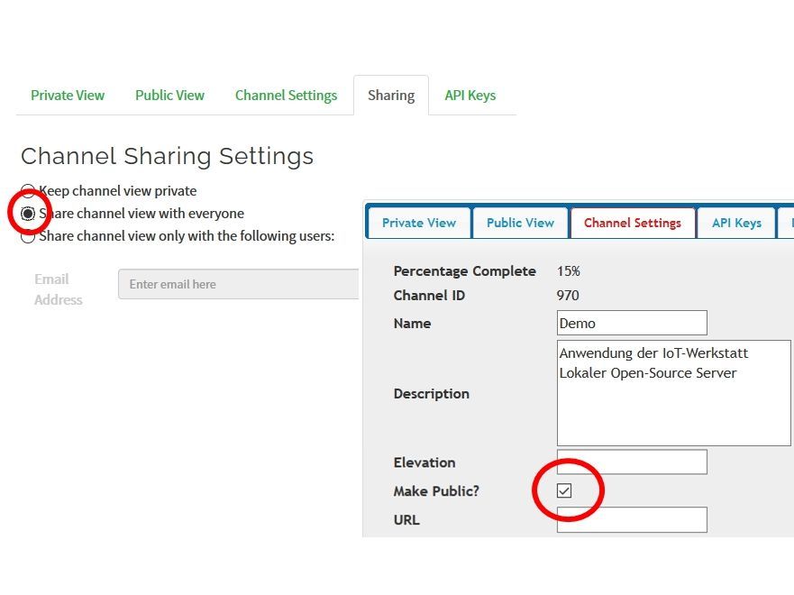 3. Eigenen Kanal erstellen (New Channel): Hier konfigurieren wir unsere Datenbank zur Ablage der Messwerte. Insgesamt bietet Thingspeak in jedem Kanal bis zu 8 Messwertfelder, von denen wir für unsere Umweltdaten hier drei nutzen. Die Bezeichnung der Messwertfelder können wir frei wählen, sie sollte aber mit der Belegung des IoT-Ardublock-Puzzleteils korrespondieren. Wer seine Daten mit anderen teilen möchte, der nutze die Sharing-Funktion (Mathworks) bzw. markiert das "Make Public"-Flag (Open Source).