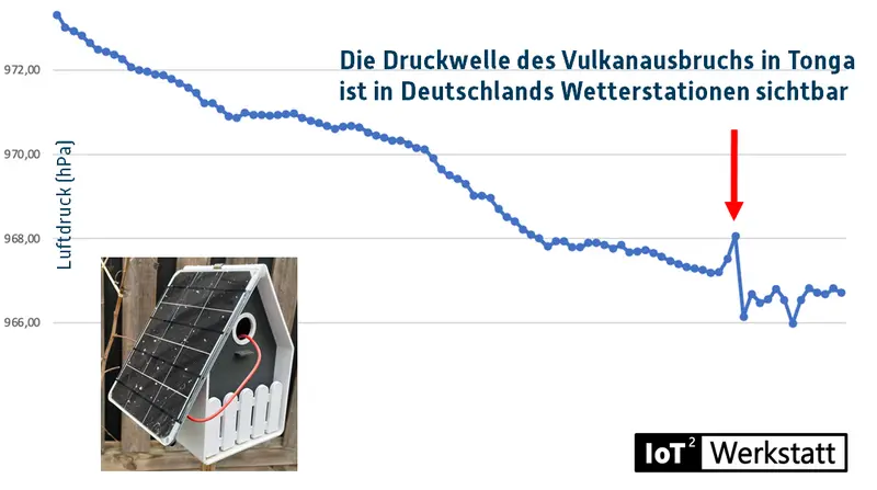 Eine Wetterstation im Vogelhäuschen übernimmt für uns das Monitoring der Umweltbedingungen. Manchmal beobachtet man dabei unverhofft auch einmalige Naturphänomene: Als im Januar 2022 ein Vulkanausbruch den Inselstaat Tonga erschüttert, registriert unsere Messtation kurz darauf eine durch die Druckwelle ausgelöste Luftdruckschwankung. Vernetzte IoT-Wetterstationen auf der ganzen Welt visualisieren die um den Erdball laufende Welle, wie das externe Video hier eindrucksvoll zeigt.