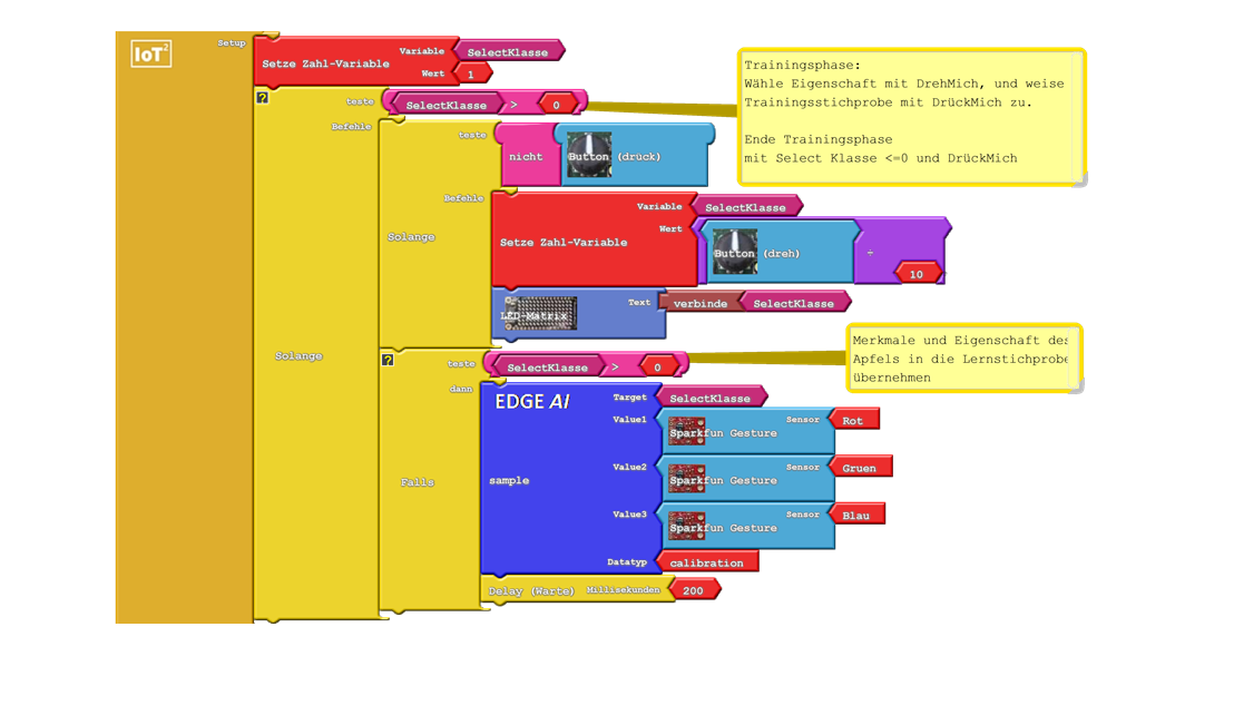 Künstliche Intelligenz ist allgegenwärtig, aber oft schwer zu durchschauen. Unsere Blaupause öffnet diese „Black-Box“ anhand eines einfachen Beispiels einer KI, die gute von schlechten Äpfeln unterscheiden soll. Mit den EDGE-AI-Blöcken der IoT2-Werkstatt läuft KI direkt auf dem Mikrocontroller – transparent, ohne Cloud und sehr energieeffizient. Wir nutzen dabei einen Algorithmus des überwachten Lernens: Die KI bekommt Beispiele mit bekannten Merkmalen und Ergebnissen. Daraus entsteht ein kleines Programm zum maschinellen Lernen, welches später selbst entscheidet, welcher Apfel wahrscheinlich gut schmecken wird. In der Trainingspahse zeigen wir der KI verschiedene Äpfel: rote, gute und grüne, saure Äpfel und speichern diese in einer Lernstichprobe. So lernt der Algorithmus die Unterschiede kennen. Kommt in der Anwendungsphase ein neuer, unbekannter Apfel, sucht die KI den ähnlichsten aus den Beispielen und sagt: „wahrscheinlich gut“ oder „eher sauer“. Genau wie wir im Supermarkt: Wir greifen zu Äpfeln, die wir von früher als lecker kennen. So entsteht eine erste, anfassbare KI, die man direkt mit echten Äpfeln testen kann.