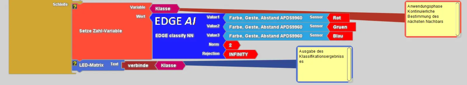 Unser EDGE-KI Block sehr universell. Ersetzen wir die RGB-Kanäle durch den VOC Sensor des Octopus (BME 680), so können wir z.B. Getränke am Geruch erkennen. Siehe künstliche Nase im COSY-Projekt. Der einzige Nachteil, wir müssen bei jedem Neustart die Lernstichprobe erneut aufbauen, d.h. die Trainingsphase durchlaufen. Im Falle einer realen Anwendung würde man dies allerdings nur einmalig durchführen und das Datenfeld dann speichern.
