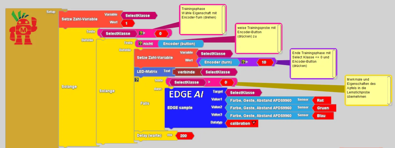 In der Trainingsphase erfassen wir für jeden Apfel seine Farbe und den zugehörigen Geschmack. Dazu halten wir den Apfel vor den Sensor und wählen mit dem Encoder eine Geschmacksklasse aus. Diese wird auf der LED-Matrix angezeigt und beim Tastendruck gespeichert: drei Farbwerte + eine Geschmacksnote (1 = lecker, 6 = sauer).