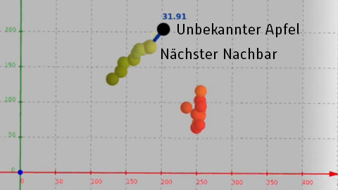 In der Anwendungsphase können wir die Eigenschaften (Geschmack) eines neuen, unbekannten Bewerbers bzw. Apfels prognostizieren. Hierzu nutzen wir einen sogenannten Nächste-Nachbarn-Klassifikator. Dieser entscheidet anhand unserer Trainingsdaten und den aktuellen Merkmalen, ob ein Apfel schmeckt oder nicht. Der Algorithmus ist sehr einfach, wir brauchen nur im Merkmalsraum zu schauen, welcher Apfel der Trainingsstichprobe unserem Apfel am nächsten kommt und schließen dann von diesem nächsten Nachbarn direkt auf die Eigenschaften des unbekannten Apfels. Optisch ist uns das sofort klar, mathematisch können wir das als euklidischen Abstand im Raum der Merkmalsvektoren bestimmen.