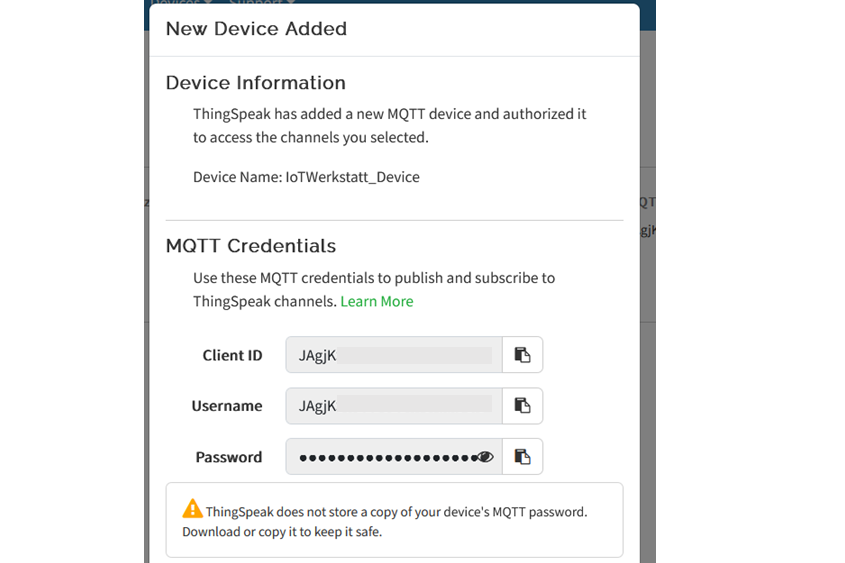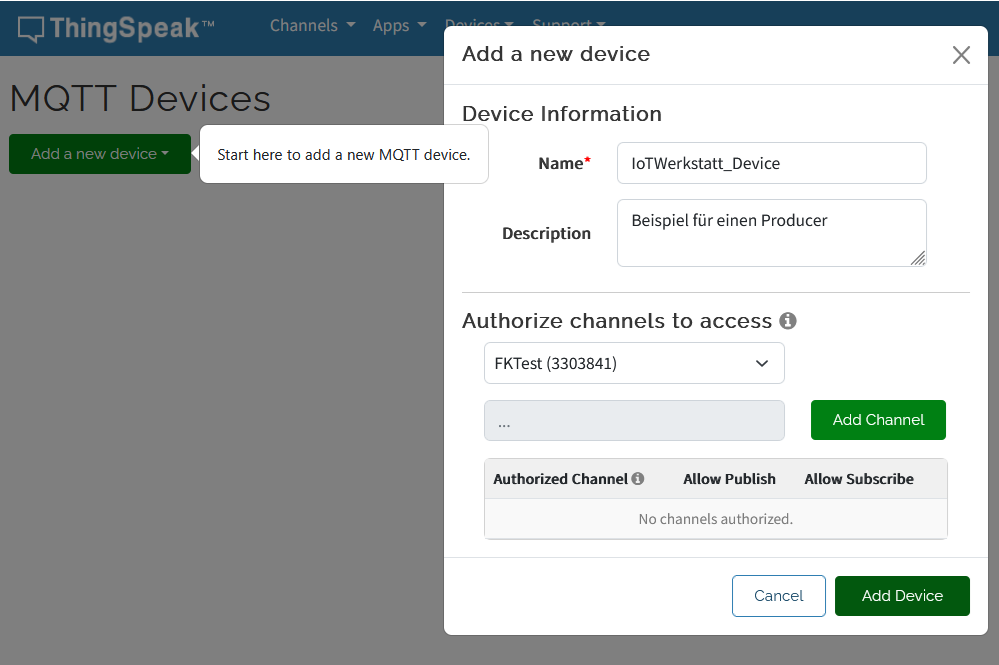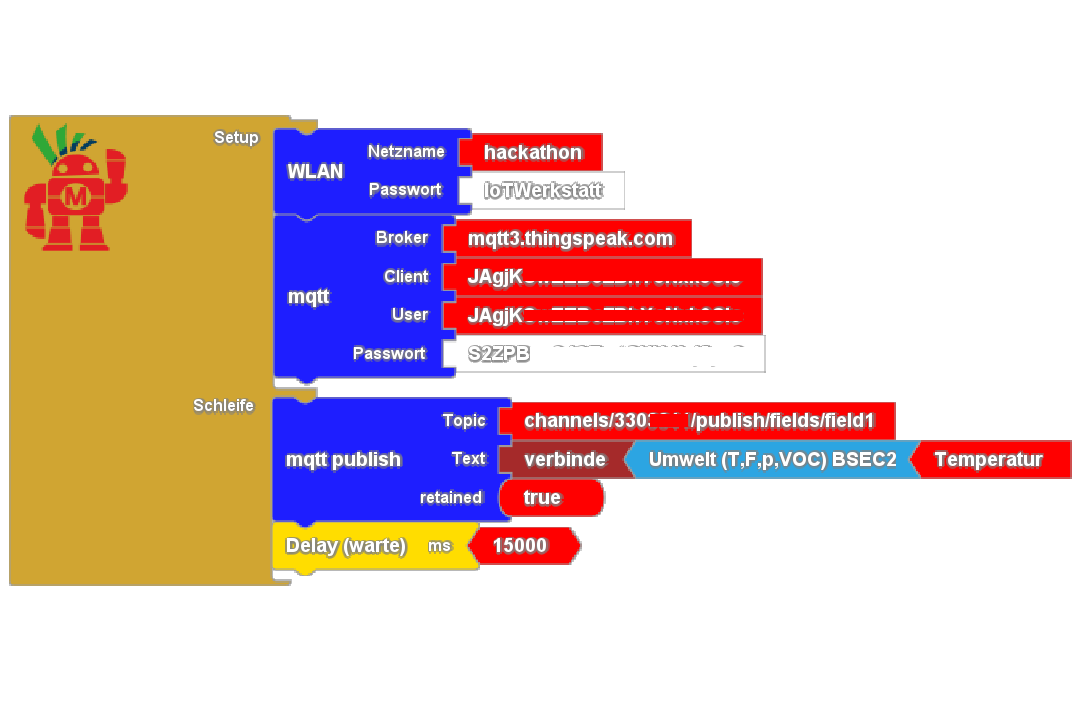 Auch die Cloud-Anwendung Thingspeak besitzt einen integrierten MQTT-Zugang und einen eigenen Broker. Wollen wir so Daten in unseren Thingspeak-Channel schreiben, so müssen wir diesen jedoch zuerst für die MQTT-Kommunikation freischalten. Dies geschieht im Web-Browser unter dem Menüfeld “Devices”. User, Client_ID und Passwort wird dann per Cut & Paste an das Ardublock übergeben. Das von Matlab vorgegebene Topic lautet: channels/channel-id/publish/fields/field1 für das erste Datenfeld im Kanal.