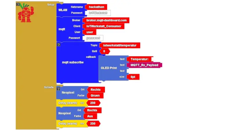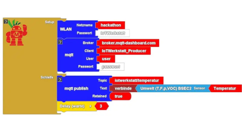Im Setup stellen wir per WLAN die Verbindung zu unserem Demo-Broker her. Wichtig ist dabei, dass wir sowohl dem Producer, als auch dem Consumer einen eindeutigen Client-Namen geben. MQTT nutzt den Port 1883, dieser Port muss im Gastnetzwerk eventuell erst freigegeben werden. Hotspot über Handy ist ein gutes Fallback. In der Loop senzen wir zyklisch unsere Messwerte (hier auf dem Topic iotwerkstatt/temperature). Wichtig ist das gleiche Topic für Producer und Consumer.