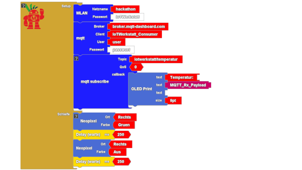 Um jetzt an unsere aktuellen Temperaturmesswerte zu gelangen, abonnieren wir das Topic “iotwerkstatt/temperature” beim Broker. Dies geschieht einmalig im Setup. Mit der Subscription haben wir ein Callback ( = Unterprogramm) definiert, welches bei jedem neuen Wert asynchron aufgerufen wird. In unserem Fall werden die aktuellen Daten (in der Variable MQTT_RX_Payload) auf das OLED ausgegeben. In der Loop können wir unser normales Programm realisieren.