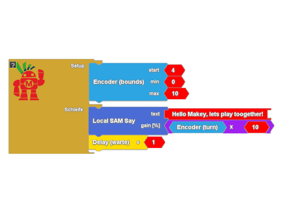 Unsere Audiosignale werden über den internen DAC des ESP32 generiert. Dieser Digital-Analog-Converter hat 8 Bit, d.h. es gibt 256 verschiedene Spannungspegel am Ausgang. Über einen kleinen Verstärker gehen die Signale normalerweise direkt an den internen Buzzer. Dieser kann Analogsignale allerdings nur unzureichend wiedergeben. Deshalb schließen wir über die vorhandenen Lötkontakte einen externen Lautsprecher an. (Achtung: Keinesfalls die Rechtecksignale der Buzzer-Blöckchen auf den Lautsprecher geben. Das Signal kann sehr laut werden, die Ohren schädigen und den Lautsprecher zerstören). Die Blöckchen für die Sprachausgabe finden wir im Baukasten “BT/Audio”.