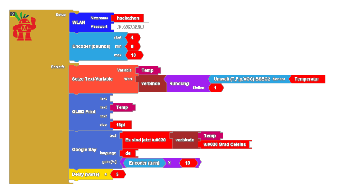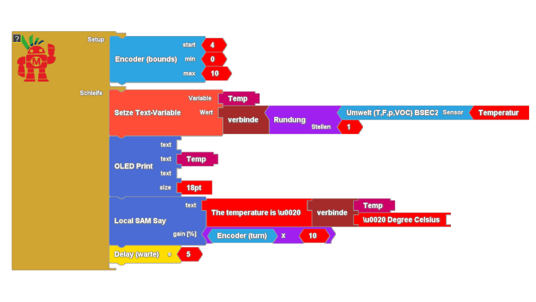 Solch eine Anwendung läßt sich mit wenig Aufwand realisieren. Wir messen die Temperatur, runden auf eine Nachkommastelle und übergeben den Messwert zusammen mit etwas Erklärungstext an die Sprachausgabe. Über den Drehencoder lässt sogar sich die Lautstärke anpassen. Die deutsche Version spricht über das cloudgestützte Text to Speech - API von Google, die englische Version nutzt die energieeffizientere lokale Sprachsynthese. Dabei lernt Google natürlich die Temperaturen in unserem Raum kennen - aus Datenschutzgründen also mit Bedacht einzusetzen.