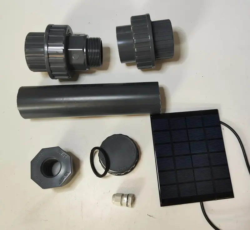 Ein handelsübliches PVC-Rohr, Schraubmuffen, ein Adapter um den Ultraschallsensor zu befestigen und eine Abschlusskappe sorgen für ein günstiges und wasserdichtes Gehäuse.