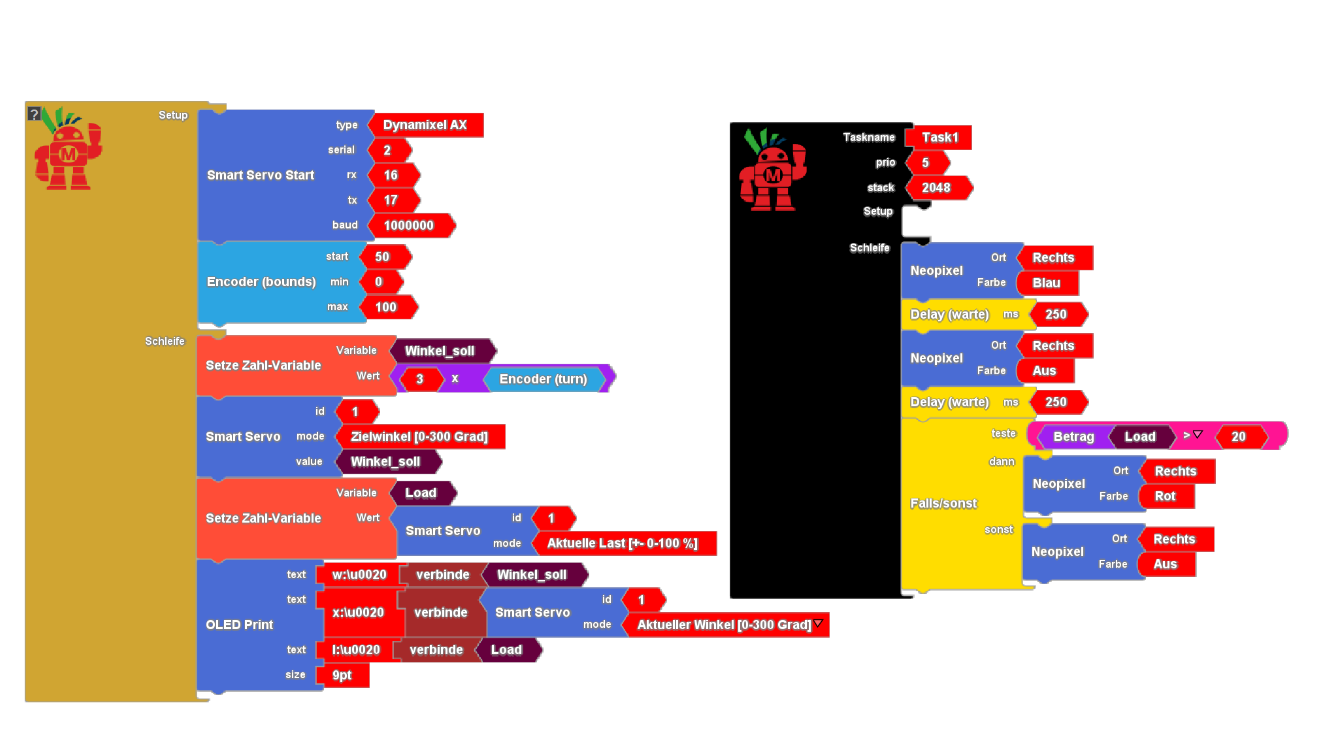 Die Ansteuerung unseres Servos haben wir nun im Griff. Wenn es aber darum geht, parallel zur Bewegung auch mit der Umgebung zu interagieren und auf plötzliche Ereignisse schnell zu reagieren, sind neue Multitasking-Fähigkeiten nötig. Das sind typische Aufgaben für ein Echtzeit-Betriebssystem wie das quelloffene FreeRTOS. Glücklicherweise hat die IoT2-Werkstatt entsprechende Features bereits implementiert. Im Werkzeugkasten “ESP32” findet sich ganz unten ein schwarzer Programmblock mit setup und loop - so wie wir ihn bereits vom Hauptprogramm in orange kennen. Damit bauen wir quasi ein weiteres Arduino-Programm (eine Task), die fortan parallel zu unserer bekannten Loop ausgeführt wird. Da der ESP32 tatsächlich zwei CPU-Kerne besitzt, können die beiden Tasks auch wirklich gleichzeitig laufen. Aus der Sicht der Informatik entstehen so nebenläufige Prozesse, die natürlich unter Umständen auch per Semaphore koordiniert werden müssen. Aber das ist dann ein Thema für eine Spezialvorlesung. In unserem Beispiel nutzen die beiden Tasks keine gemeinsame Ressourcen (I2C-Bus für Sensoren oder OLED zur Anzeige), so dass wir auf Koordination verzichten können. Task 2 (schwarz) ist für die Neopixel zuständig, blinkt zylisch in blau und überwacht den Belastungszustands unseres Servos. Ist der Load über 20 %, dann signalisiert der linke Neopixel den Belastungszustand in rot.