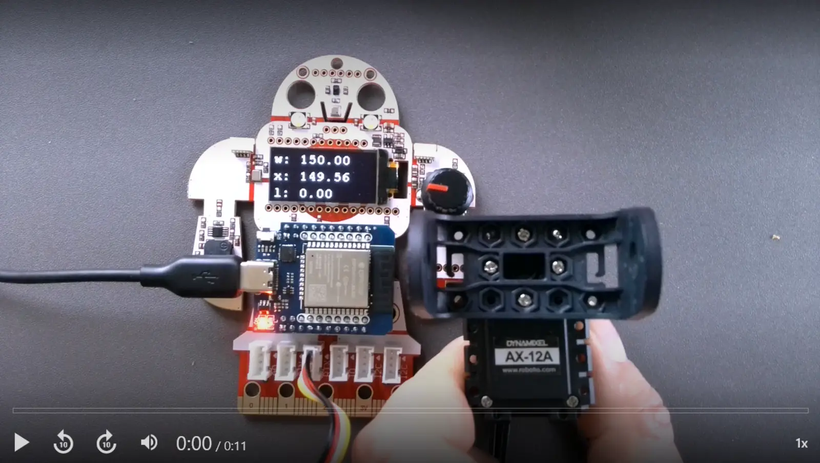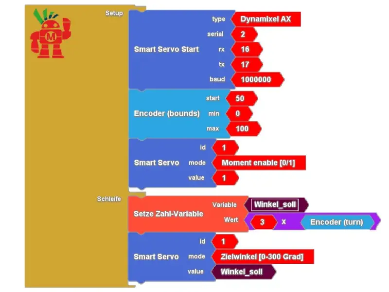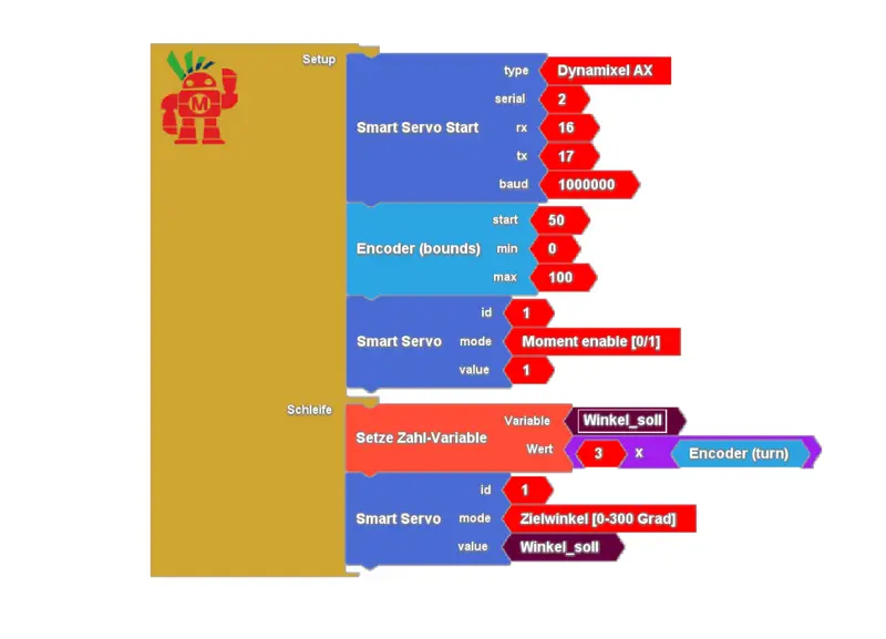 In einem ersten Experiment verbinden wir den ESP32 gemäß Schaltplan mit einem Servo (hier ID 1) und testen die Funktion. Dazu verwenden wir den Dynamixel Baustein aus dem Werkzeugkasten für “Externe Interfaces”. Zur Vorgabe des Drehwinkels (zwischen 0 und 300 Grad) nutzen wir unseren Drehencoder. Nach Aufwachen sind die Servos “kraftlos”, d.h. der Sollwert für den Winkel wird noch nicht automatisch angefahren. Mittels “Torque enable” wird das Servo auf “on” geschaltet. Mit diesem einfachen Aufbau haben wir bereits einen fernsteuerbaren Servo realisiert, der den Drehbewegungen des Encoders folgt.