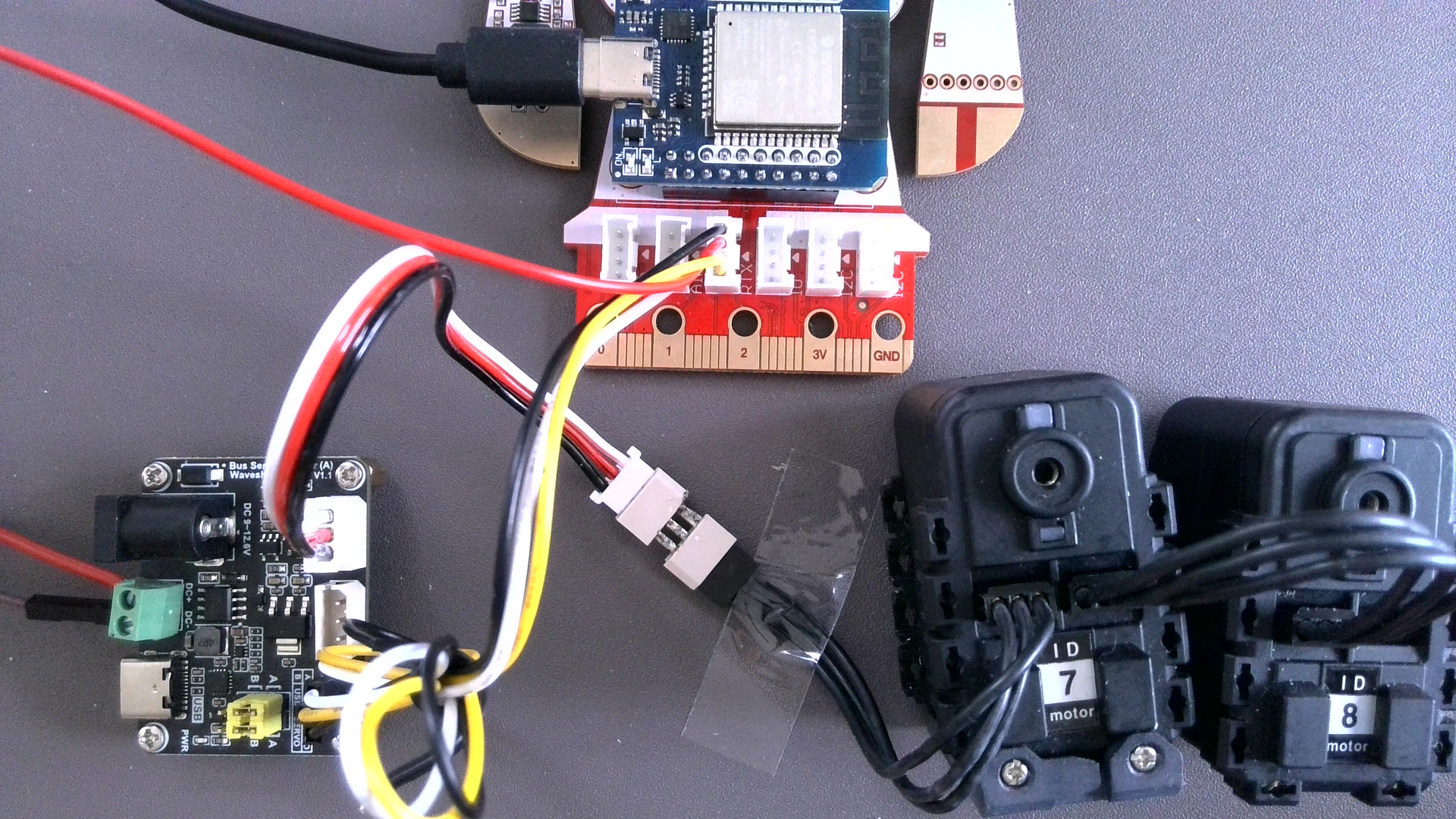 Digitale Schnittstelle: Der AX-12A wird nicht nur über ein PWM-Signal gesteuert, sondern über eine serielle TTL-Kommunikation im Daisy-Chain-Bus-System. Die Kabelführung des Busssystems ("das Nervensystem") vereinfacht sich dramatisch. Das bedeutet: mehrere Servos können hintereinander geschaltet werden, jeder Servo besitzt eine eindeutige ID, Position, Geschwindigkeit, Temperatur und Last können ausgelesen werden. Wir verwenden den waveshare Adapter der Waveshare Servos zum Anschluss an Serial2 der Grove-Buchse. (Achtung: andere Pinbelegung der Servoanschlüsse).