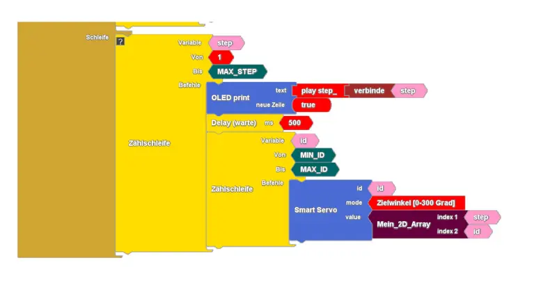 Das Gedächtnis, also welche Positionen der Roboter gelernt hat, besteht aus einem zweidimensionalen Datenfeld und verbindet die beiden Teilschritte. Unser zweidimensionales Datenfeld “Mein 2D_Array” besteht aus vielen Fließkommazahlen, die ähnlich wie ein Getränkekasten in Spalten zun Zeilen angeordnet sind. In unserem Beispiel stehen die die Zeilen für die einzelnen Steps, die wir zeiltlich abfolgend durchlaufen. Die Spalten repräsentieren die ID der verbauten Servos. Die Inhalte des Feldes beeinhalten also die Werte für die Winkelpositionen des jeweiligen Servos an einem bestimmten Step. Zusammengfasst: Zeilen = Steps, Spalten = Servo ID, Zu jedem Schritt gibt es also für alle Servos eine Sollposition. Aus syntaktischen Gründen der Hochsprache C müssen wir die Dimension unseres Datenfeldes bereits beim Übersetzen festlegen. Hierbei sind nur Zahlenkonstanten gestattet. Wir verwenden sogenannte Predefinitions (grüne Puzzelteile), die einer Zahlenkonstante einen symbolischen Namen geben. Das verbessert Les- und Wartbarkeit unseres Algorithmus. Gemäß guter Programmierpraxis werden Prefdefinitions immer in Großbuchstaben benannt. Das erleichtert später die Unterscheidung zwischen konstanten Symbolen (Großbuchstaben, grün) und einer Variable (violett).