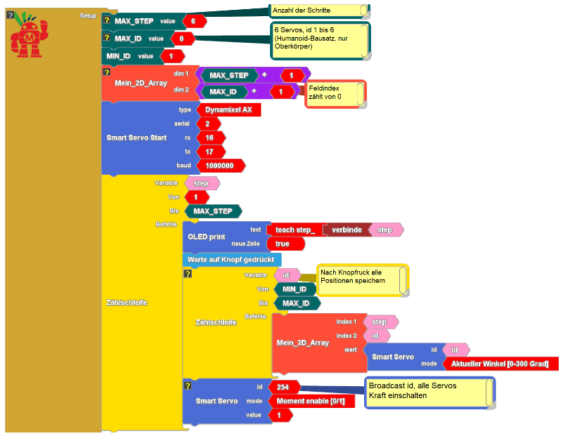 Während des “Teaching” (Setup) schaltet unser Algorithmus zuerst alle Servos in den kraftlosen Zustand, denn nur so können wir die einzelnen Gelenke per Hand bewegen - eine Grundvoraussetzung für das Teaching. Anschließend durchlaufen wir alle Steps und speichern zu jedem Schritt die über den Bus abgefragten aktuellen Gelenkpositionen der Servos MIN_ID bis MAX_ID im Datenfeld. Damit wir jede Schritt (jede Pose unseres humanoiden Roboters) einzeln trainieren können, wird die Position erst dann übernommen, wenn der Dreh-Drückmich Knopf betätigt wurde.