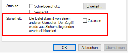 Hinweis 2: Sollte sich die Datei nicht ausführen lassen, wähle mit Rechtsklick auf die Datei - "Eigenschaften" im Bereich Sicherheit "Zulassen" aus und versuche es erneut