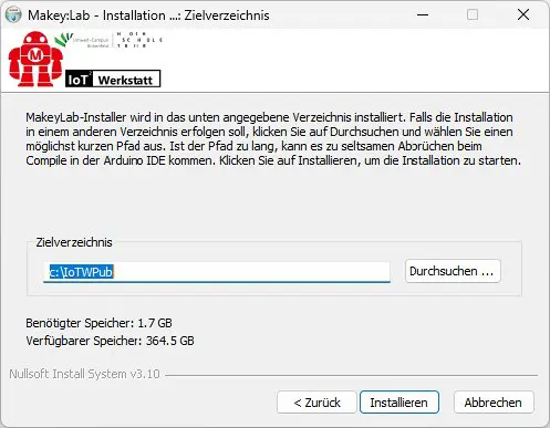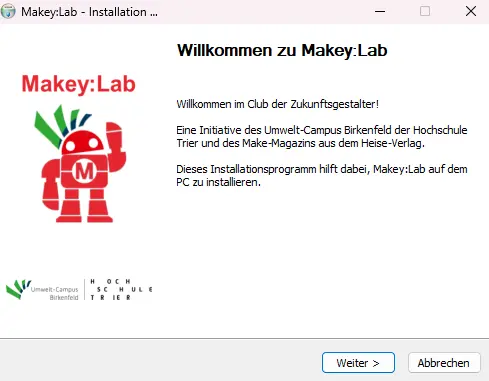 Über den Download erhältst du das Installationsprogramm (Win_MakeyLab_Installer_Vxxx.exe). Das ist eine ausführbare Datei, die du per Doppelklick startest. Falls Du auch den USB-Treiber installieren must, benötigst Du dazu Admin-Rechte. Standardmäßig wird die Software im Ordner C:\Benutzer\Öffentlich\IoTW (beziehungsweise C:\Users\Public\IoTW) installiert und benötigt ca. 1,7 GB Speicherplatz. Aktuell ist die Software nur für Windows verfügbar, eine Linux-Version ist in Vorbereitung.