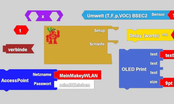 Zunächst musst du dir Gedanken darüber machen, was dein Programm können soll. Für ein einfaches Beispiel können wir einen Teil der Umweltmessung von eben nachbauen. Am Ende soll auf dem Display des Makey:Lab die Umgebungstemperatur angezeigt werden.
