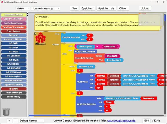 Das Programm liest den Umweltsensor aus und zeigt Temperatur, Feuchtigkeit oder Luftdruck auf dem Bildschirm des Makey:Lab an. Du kannst mit dem Encoder (Drehregler) auswählen, was du sehen möchtest. Um das Programm, auch Sketch genannt, auf dein Makey:Lab zu übertragen musst du einfach oben rechts auf Upload klicken. Nun wird der Code automatisch aus den Blöcken zusammengesetzt, kompiliert (also in Sprache übersetzt, die der Microcontroller versteht) und über das USB Kabel aufgespielt.