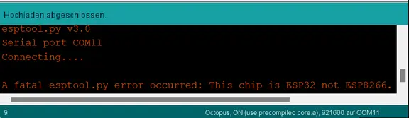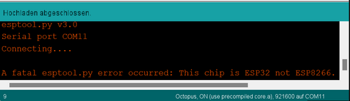 Du nutzt den Octopus (ESP8266), hast aber in der Arduino-IDE ein anderes Board (Makey, ESP32) ausgewählt oder umgekehrt. Unter Werkzeuge -> Board -> ESP8266 -> Octopus oder ESP32 -> Makey läßt sich das richtige Board einstellen.