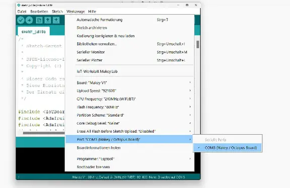 Du findest eine Verknüpfung mit dem Namen MakeyLab auf deinem Desktop. Wenn du es nicht gleich entdeckst, kein Problem, dann drücke einfach die Windowstaste und gib den Namen ein. Dir sollte die Verknüpfung nun angezeigt werden. Es öffnet sich nun die sogenannte Arduino IDE. Das ist das Programm, welches die Kommunikation zwischen unserer IoT2-Werkstatt und der Platine ermöglicht. Hier musst du nur einmal einstellen, an welchem Port deine Platine angeschlossen ist. Dies geht unter Werkzeuge > Port. Manchmal sind mehrere Ports aufgelistet, am Namen erkennst du aber den Makey bzw. Octopus. Falls du den Octopus nutzt, musst du zusätzlich unter Werkzeuge -> Board -> ESP8266 den Octopus auswählen. Denn beide Platinen nutzen verschiedene Hardware und damit auch eine andere Toolchain.