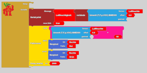 Mit dem Sensor BME680 werden Temperatur, Luftfeuchtigkeit und Luftdruck gemessen. Die Ergebnisse können mittels Serial Print auf dem seriellen Monitor (Werkzeuge>Serieller Monitor) ausgegeben werden. Je nach Luftfeuchte oder Temperatur können entweder Farben über einen Neopixel angezeigt oder die Werte auf einer LED-Matrix dargestellt werden.