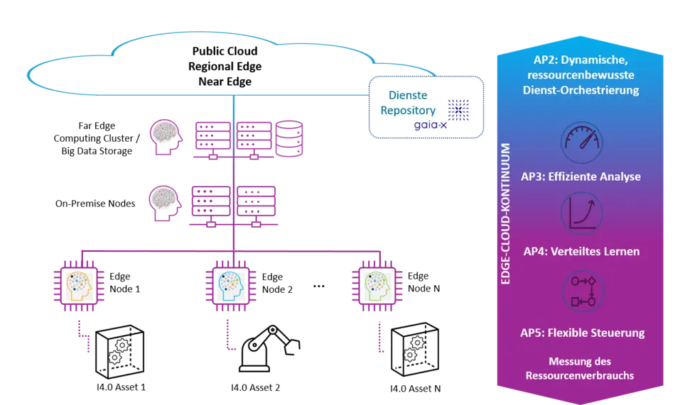Für die Fertigungsorganisation nach dem Leitbild der Industrie 4.0, ermöglicht das Edge Computing die datensouveräne, echtzeitnahe Verarbeitung von Daten direkt am Ort der Entstehung. Durch die mit Edge Computing einhergehende deutliche Reduktion der Latenzzeiten wird die produktionsnahe Nutzung industrieller Analytik-, Steuerungs- und KI-Anwendungen vorangetrieben. Dies verspricht eine Steigerung von Produktivität und Ressourceneffizienz für den gesamten Fertigungsprozess. Ziel des Projektes EASY ist es, diese Mehrwerte dadurch zu bewirken, dass ein leicht nutzbares Edge-Cloud-Kontinuum geschaffen wird, das eine Laufzeitumgebung und Dienste für die Ausführung KI-basierter Analyse- und Steuerungsprozesse bereitstellt. Innerhalb dieses Kontinuums wird automatisiert eine dynamische, im Hinblick auf Energiebedarf, Datennutzung und -übertragung optimierte, verteilte Ausführung der Dienste im gesamten Spektrum von zentralen Cloud- bis dezentralen Edge-Instanzen ermöglicht. Insbesondere werden so Data Science- und Steuerungsverfahren leichter für die Automatisierung auf SPS- und Feldebene nutzbar, sodass sich für Anbieter solcher Verfahren neue Marktperspektiven erschließen. Durch Standardisierung und Offenheit wird dazu ein umfassendes Ökosystem geschaffen, welches für rasches Wachstum und internationale Strahlkraft sorgt und zugleich die Markteintrittsbarrieren für neue Akteure, insbesondere KMUs senkt.
