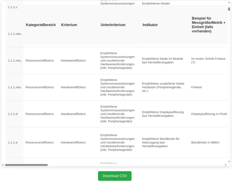 Darüber hinaus wurden einige bestehende Kriterien und Indikatoren angepasst, um die Integration von KI-basierten Systemen zu verdeutlichen und den Katalog an den Technikfortschritt anzupassen. Der so entstandene Katalog umfasst 32 Kriterien in die Bereiche Ressourceneffizienz, Ressourcenbewusste Hardware-Nutzung und Nutzungsautonomie kategorisiert sind. Zur Operationalisierung der Kriterien werden insgesamt 115 Indikatoren bereitstellt. Um die Sammlung in der Praxis anwendbar zu machen wurden die Indikatoren um weitere Informationen, wie Beispielen für verwendbare Messgrößen bzw. Metriken, Ergebnisbeispiele, Beschreibungen wie die Werte erhoben werden können, Schilderungen der Relevanz für die Umweltwirkungen, Filter, bzw. Ausschlusskriterien, etc. ergänzt. Die aktuelle Version des Katalogs, sowie Anwendungsbeispiele und Messergebnisse werden über die NEXUS-Toolbox bereitgestellt.