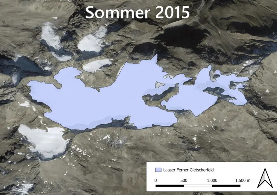 This video presents a comparative visualisation of the Laaser Ferner glacier over four decades: 1986, 1999, 2015 and 2023. It is evident from the video that the glacier field has undergone a reduction in size over time.