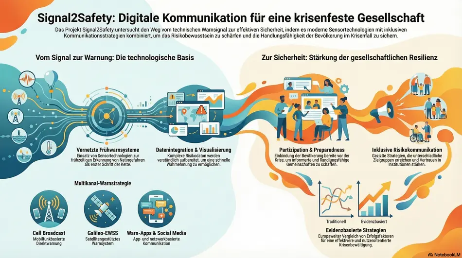 Wie können Gesellschaften besser auf Naturkatastrophen vorbereitet werden? Das Projekt From Signal to Safety untersucht, wie digitale Warnsysteme und moderne Risikokommunikation dazu beitragen, die Resilienz der Bevölkerung gegenüber zunehmenden Extremereignissen zu stärken. Im Zentrum steht die Erkenntnis, dass Resilienz nicht allein durch technische Systeme entsteht, sondern durch informierte, handlungsfähige und eingebundene Gesellschaften. Eine wirksame Risikokommunikation fördert Risikobewusstsein, stärkt Vertrauen in Institutionen und ermöglicht koordiniertes Handeln im Krisenfall.