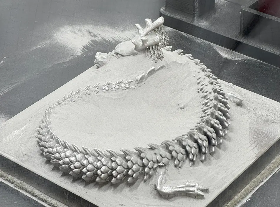Schicht für Schicht (20 µm) wurde er während 10 Stunden Druckzeit in unserem MPrint Oneclickmetal additiv gefertigt. Nachdem der Drache von der Platte gesägt, manche Stützen entfernt und glänzend nachbearbeitet wurde, darf er jetzt gern bei uns bewundert und gestreichelt werden. Drachen lieben das!